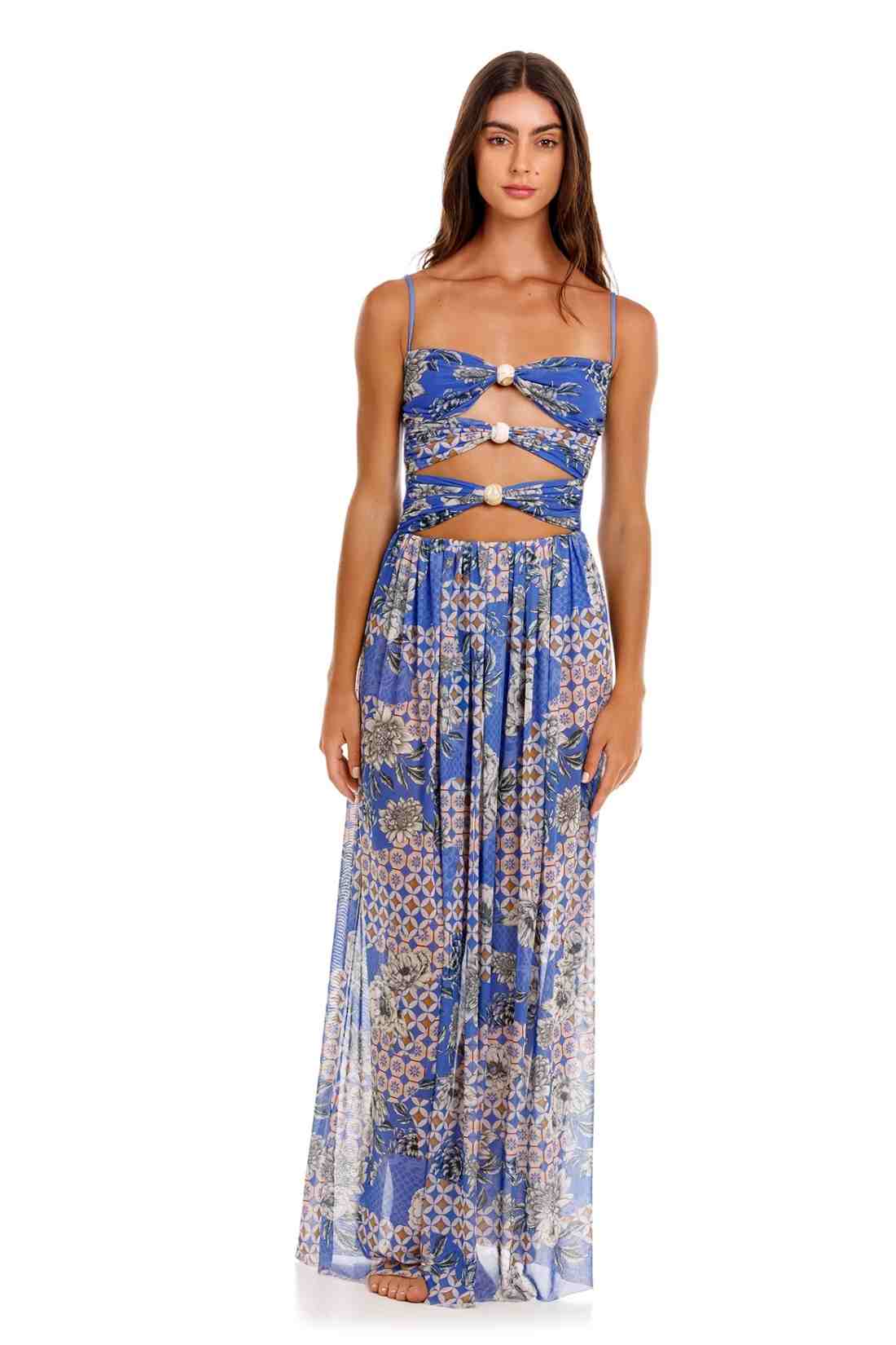 The Meeg Maxi Dress is a statement piece made for sun-drenched days and warm evenings. It features a series of bold cutouts at the front, held together with unique marble-like beads that add a crafted touch. The see-through skirt flows effortlessly with movement, while the adjustable straps ensure the perfect fit.