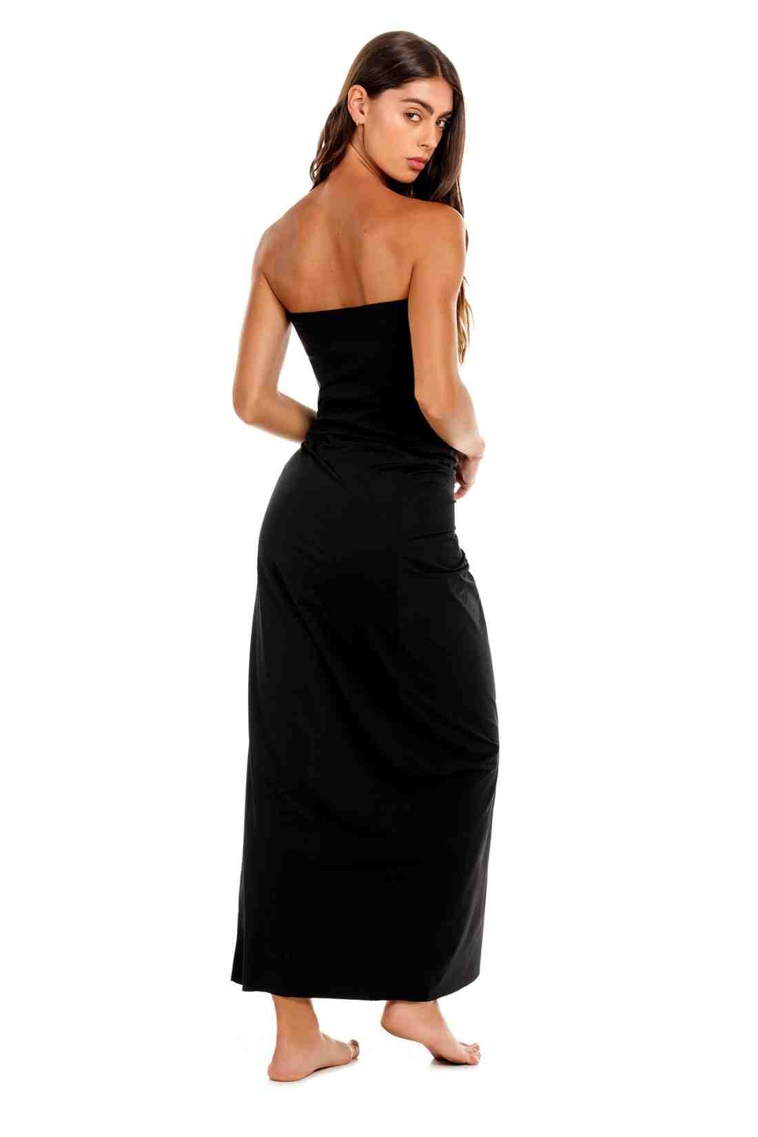 The Melina Dress is a sleek strapless silhouette that redefines minimal elegance. Designed with a flattering pull-on fit, it features a bold front slit and a sculptural marble-like ring that gathers the fabric for a soft drape effect. Perfect for warm evenings, getaways, or dressing up your swimwear.