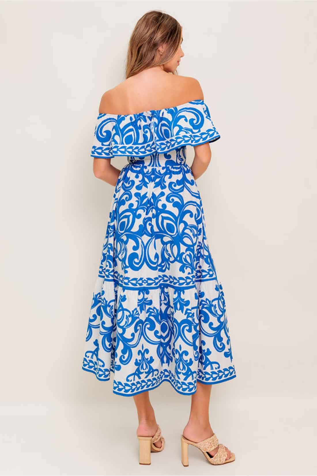 Elevate your style with this Blue Printed Off Shoulder Midi Dress, designed to turn heads effortlessly. Its flattering off-shoulder neckline with a delicate flounce adds a touch of feminine charm, while the ruffled hem creates graceful movement as you walk. Crafted from comfortable woven fabric, this dress combines elegance with ease. A discreet back zipper ensures a seamless fit, making it perfect for any special occasion or a chic day out. Embrace effortless sophistication and standout beauty every time you wear it.