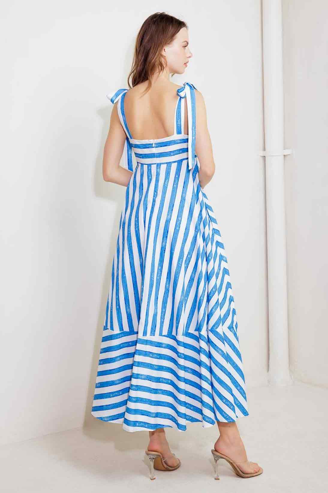 Elevate your wardrobe with this Blue Striped Midi Dress, designed for effortless elegance. The straight neckline and shoulder tie accents highlight your feminine silhouette, while the flowing circle skirt offers graceful movement throughout the day. Crafted from a comfortable printed woven fabric, this dress features a discreet back zipper closure for a flattering fit. Perfect for both casual outings and special occasions, it combines style and comfort in one stunning piece.