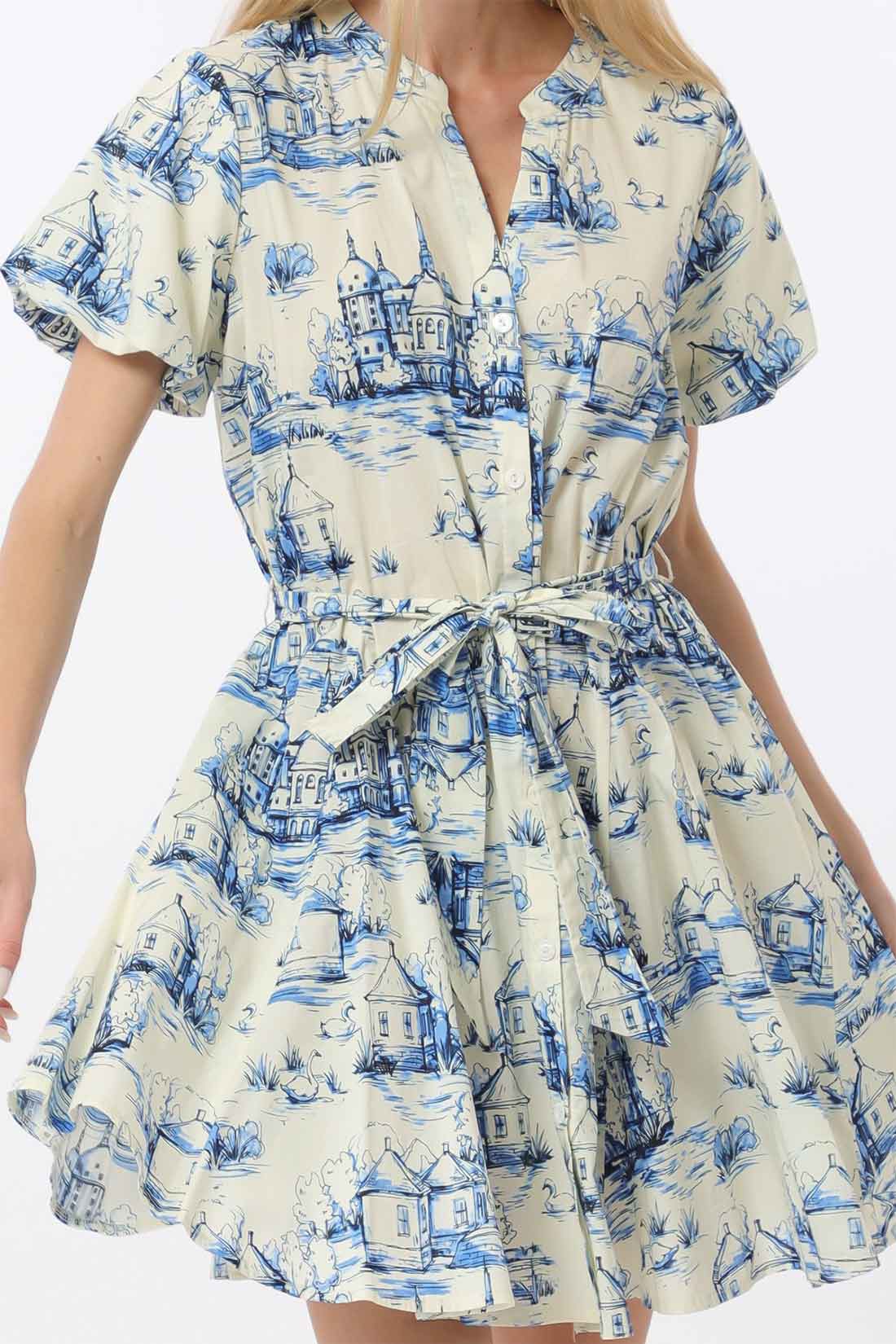Elevate your wardrobe with the Ivory Blue Bubble Belted Mini Dress, featuring a flattering belted waist and playful short bubble sleeves. The button-down front adds classic charm, while the mini length keeps it flirty and fresh. Perfect for both casual outings and special occasions, this dress combines comfort and style effortlessly. Embrace a look that moves with you and highlights your silhouette with ease.