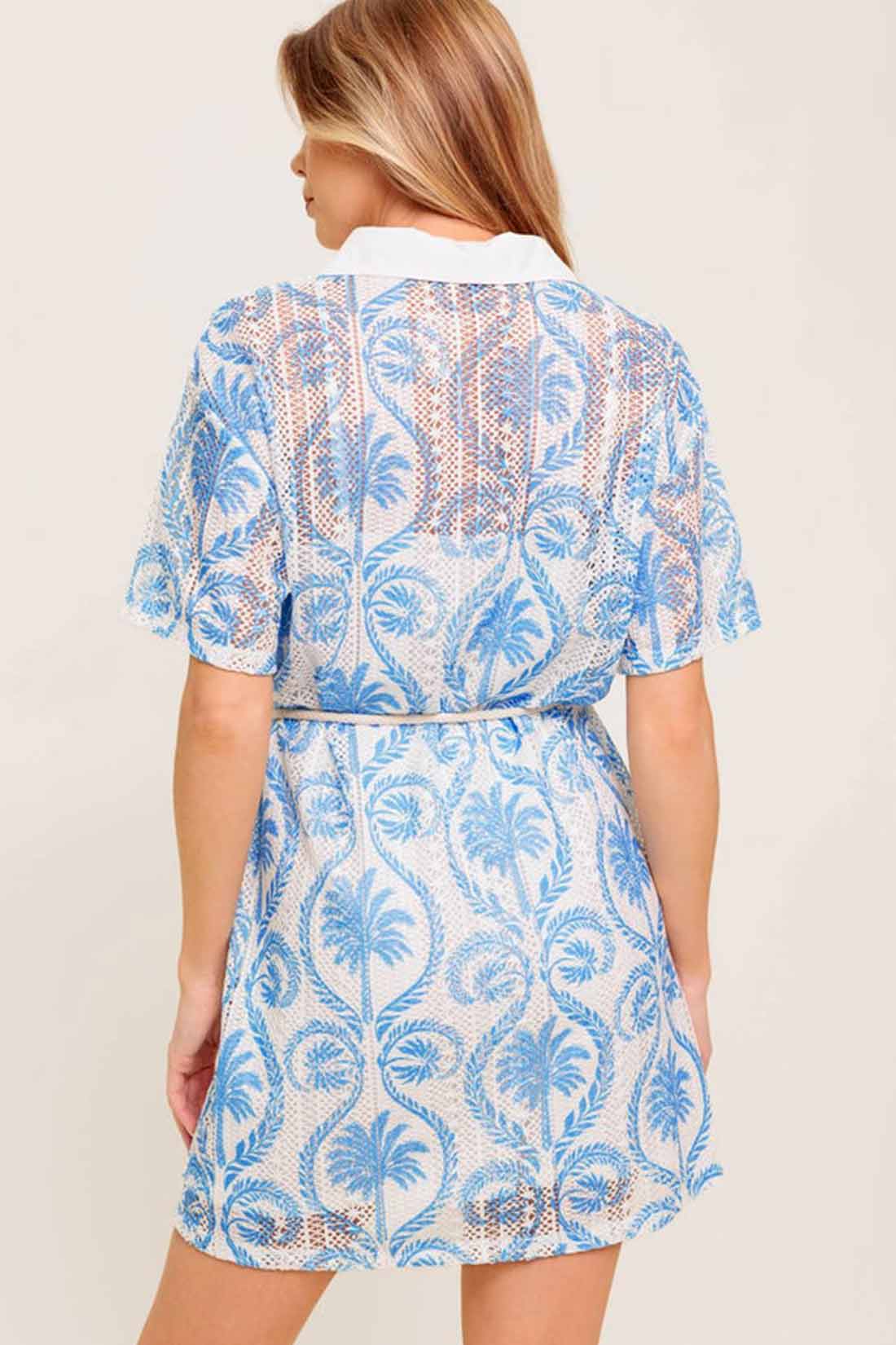 Elevate your wardrobe with the Ivory Blue Lace Mini Dress, crafted from delicate printed woven lace for a lightweight, breathable feel. This feminine piece features a chic collar, short sleeves, and a flattering button-down front for easy styling. The adjustable rope belt cinches your waist to enhance your silhouette, while the included cami ensures comfort and coverage. Perfect for summer outings or special occasions, this dress combines elegance and effortless charm in one stunning look.