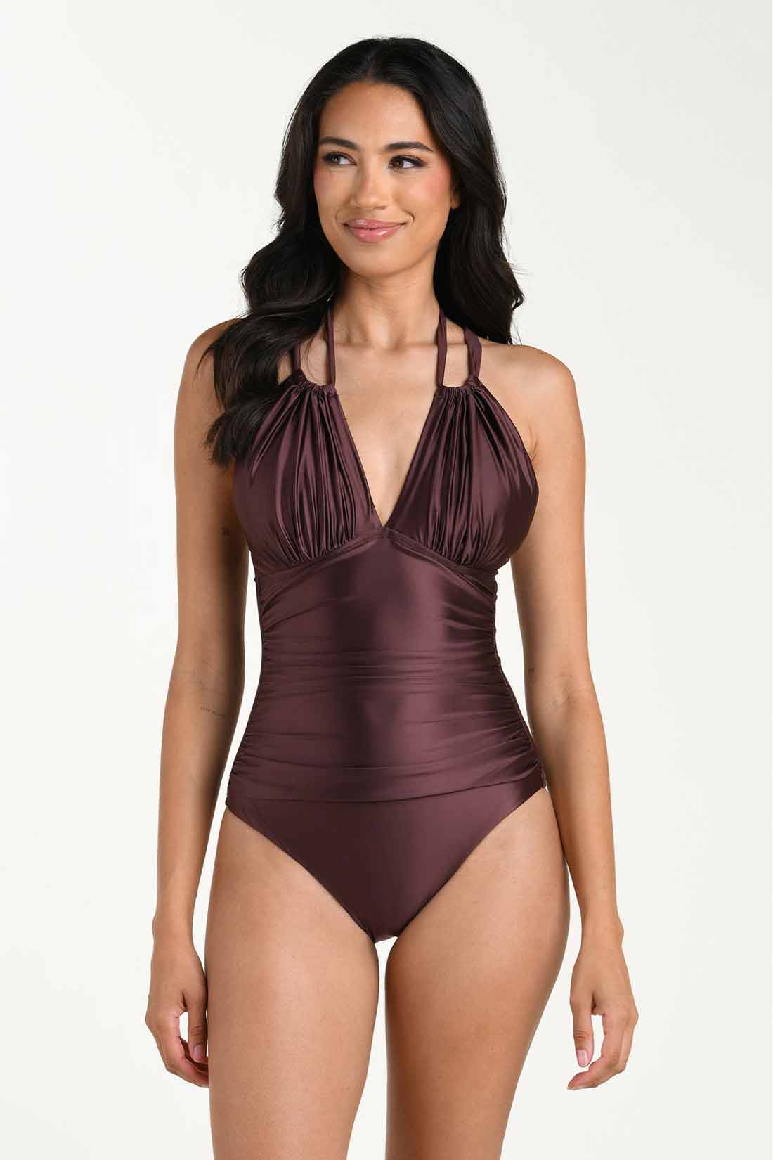 This fabric from our Earth Goddess collection exudes a luxurious high-shine truffle color with warm undertones, creating a sophisticated and flattering look. This high neck one-piece swimsuit features a keyhole plunge neckline and a low scoop back. Removable cups and adjustable straps offer support and customization. Slimming fabric complete a smooth, flawless look.
