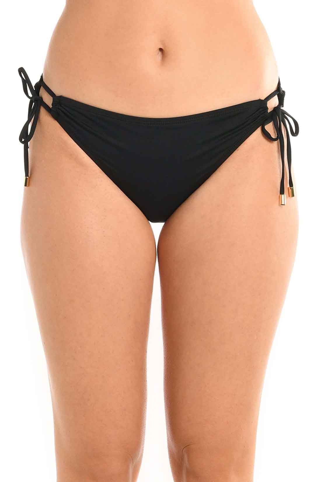 Elevate your beach look with the La Blanca Island Goddess Black Halter Bikini Set. Featuring a flattering triangle top with a V-plunge neckline, ruching details, and molded cups for support and shape. Adjustable straps and a self-tie back offer a perfect fit, while the hipster bottom with adjustable loop side ties and gold cord ends ensures comfort and style. Enjoy moderate back coverage as you soak up the sun in confidence and elegance.