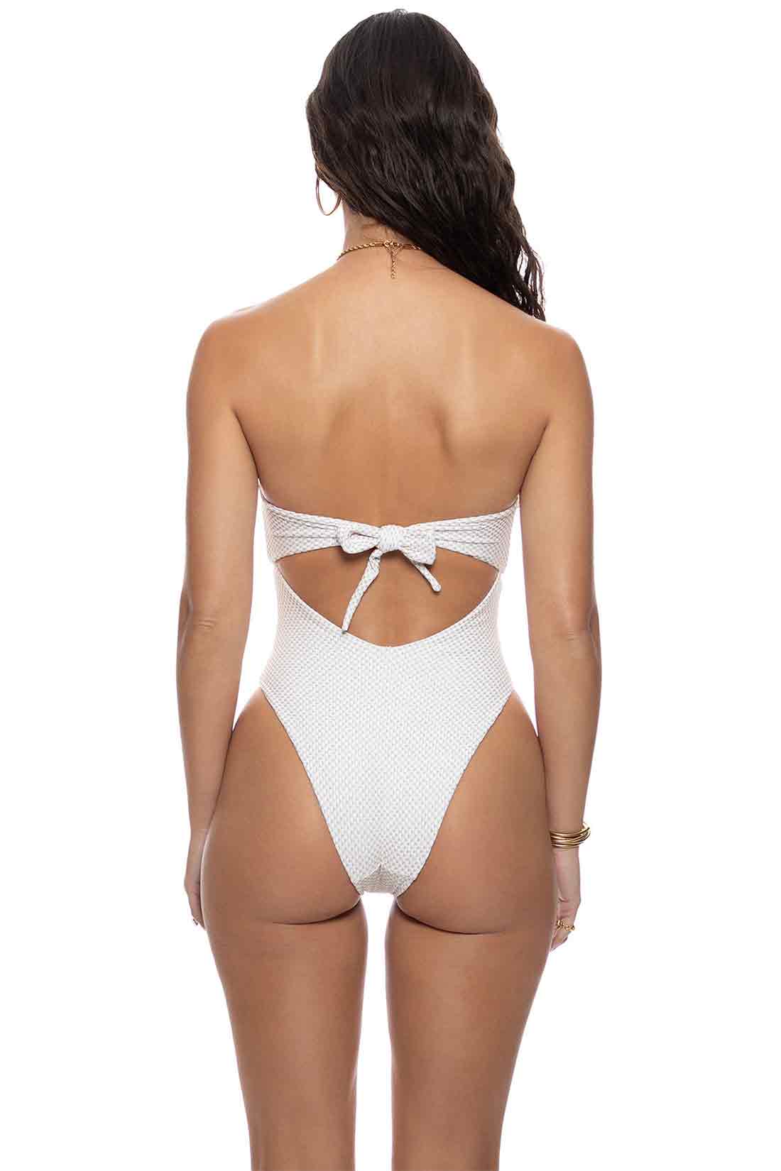 Elevate your swimwear collection with the Lulifama Sunkiss White Cutout One Piece. Featuring a stylish bandeau design with a distinctive double center Luli ring, this suit combines fashion and function. The high-cut silhouette elongates your legs, while the textured fabric adds a sophisticated touch. Removable cups provide customizable support for your comfort. Perfect for making a confident statement by the pool or beach.