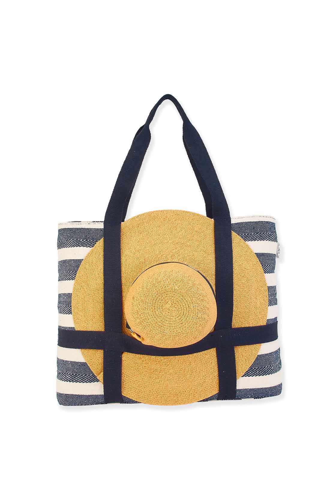 This navy shoulder tote transforms everyday carry with its innovative built-in hat carrier—a thoughtful feature for travelers and beach enthusiasts. Crafted from artistic canvas, it combines durability with distinctive style, while the 10" strap drop ensures comfortable, adjustable shoulder wear. At 21" x 5" x 17", this spacious tote accommodates everything from vacation essentials to daily necessities without compromising on portability. Whether you're heading to the shore, exploring a new city, or managing weekend adventures, this versatile bag keeps your hands free and your style on point.