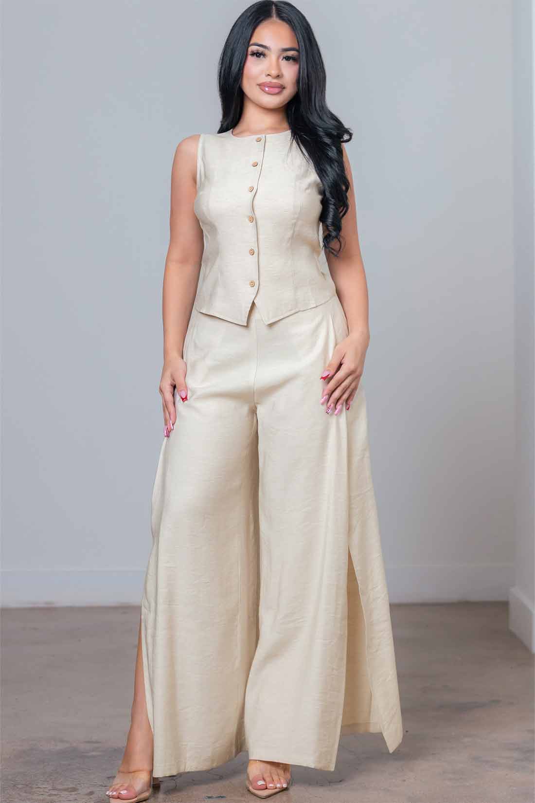 Elevate your wardrobe with this sophisticated oatmeal linen vest and pants set. Crafted from breathable linen, this coordinated duo offers effortless style for any occasion—from casual brunches to relaxed evening gatherings. The neutral oatmeal tone pairs seamlessly with your existing pieces, while the structured vest adds dimension and polish. Perfect for those seeking comfort without compromising on elegance, this set delivers versatile styling that transitions beautifully from day to night. Embrace relaxed luxury with a timeless combination designed for the modern lifestyle.
