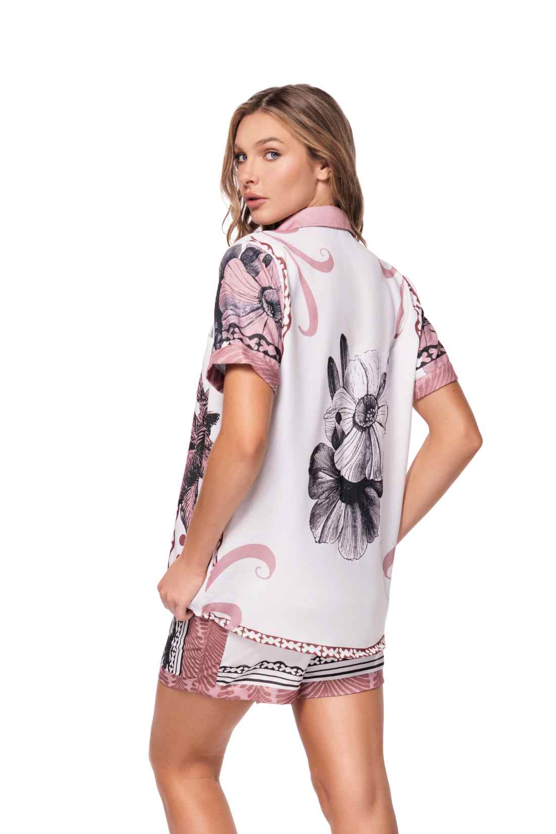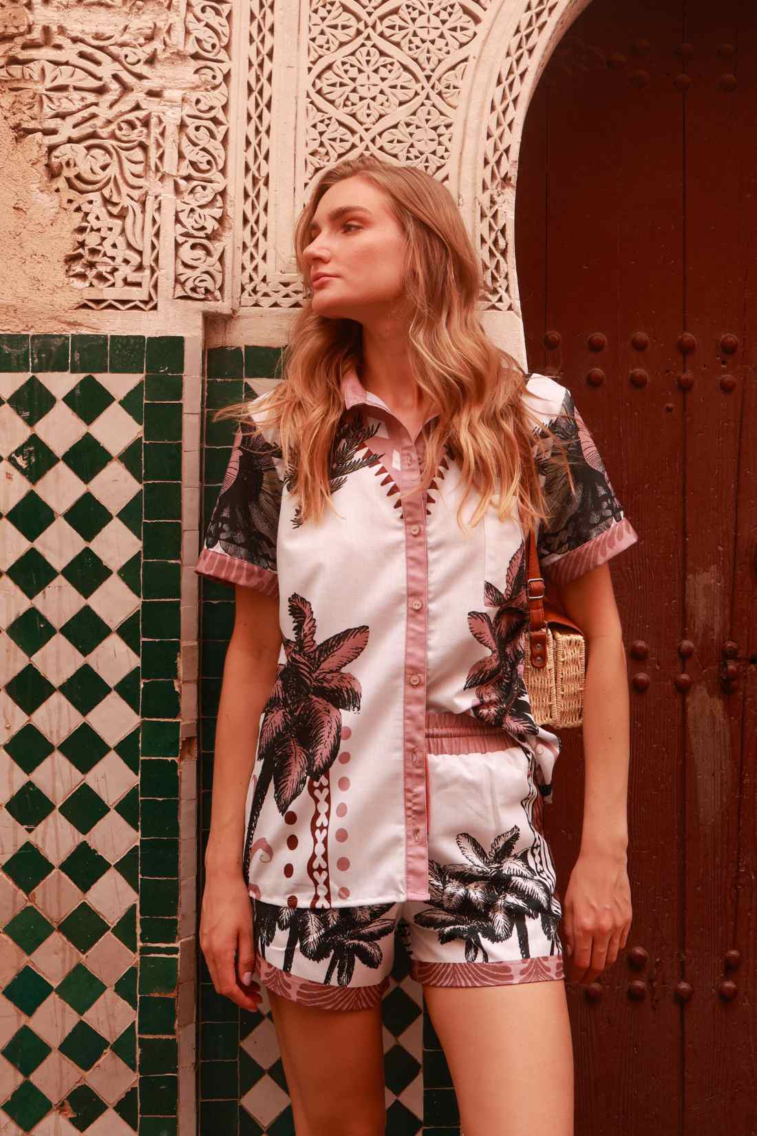Experience effortless style with the Ola Azul Noah Harper Bali Shorts Set. Featuring a loose-fit button-down shirt with a bold placement print and a handy front pocket, this set offers both comfort and flair. The mid-rise printed shorts complement the look with an elastic waistband and practical side pockets, ensuring ease of movement and convenient storage. Perfect for relaxed days and casual outings, this set combines eye-catching design with everyday functionality. Model wears a size small.