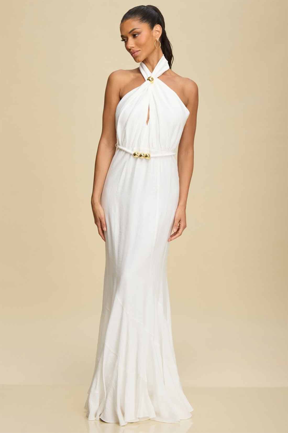 Elevate your evening with the White Dreamer Gold Maxi Dress, featuring a chic halter neckline and stunning gold accents. Its flowing silhouette ensures graceful movement, while the intricate gold details add a touch of luxury and sophistication. Perfect for making a memorable impression at any special occasion.
